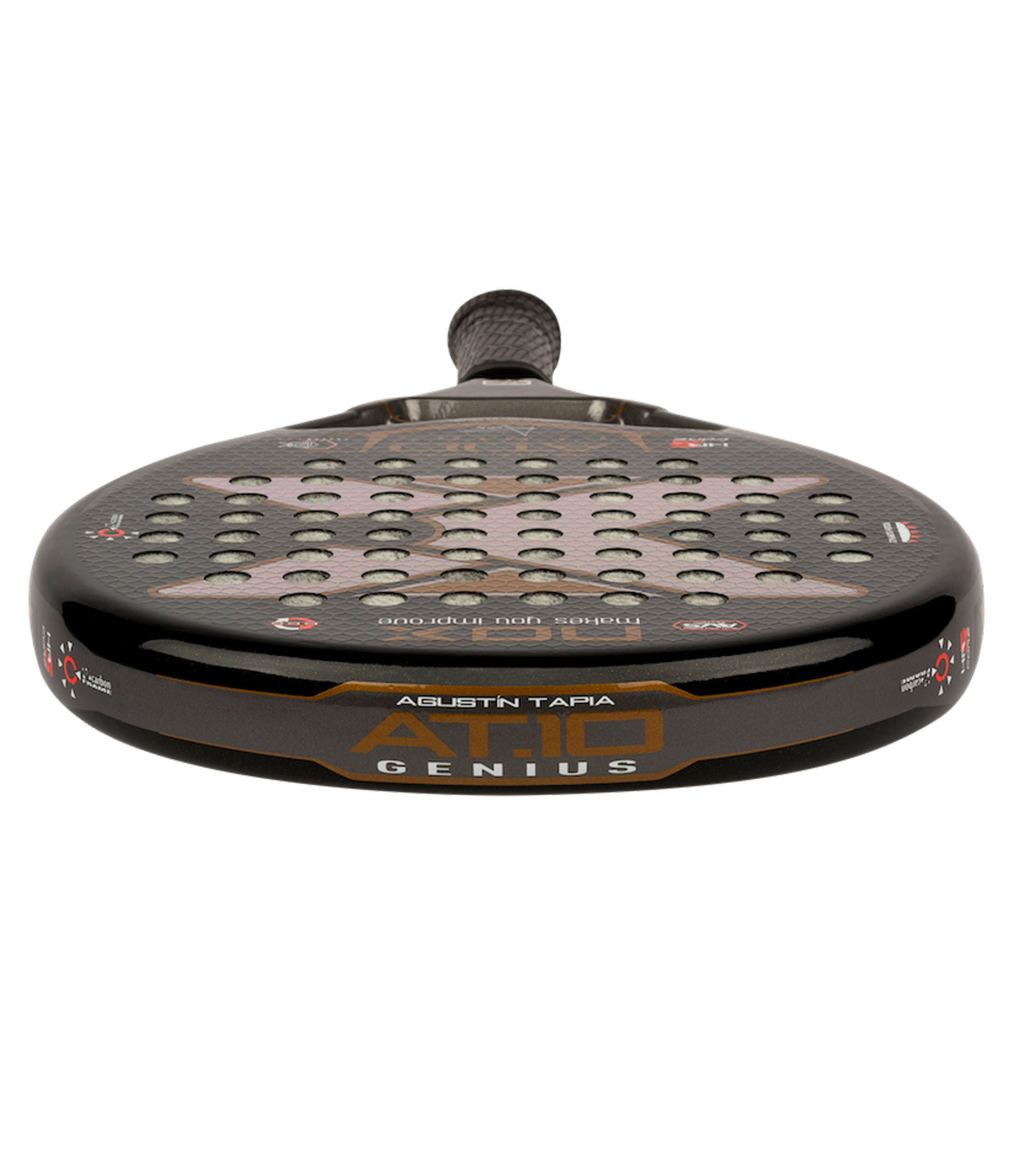 La At10 Hard 2022, una pala de altas prestaciones por las innumerables tecnologías que incorpora como Carbono Frame, Dynamic Composit Structure, HR3 Core y Rough Surface, Además de todas estas tecnologías que mejoran la resistencia, evitan vibraciones, mejoran el tacto de la pala, imprimen mayor potencia y mejoran los tiros liftados por la rugosidad que incorpora, la pala cuenta con carbono 12k en ambas caras.